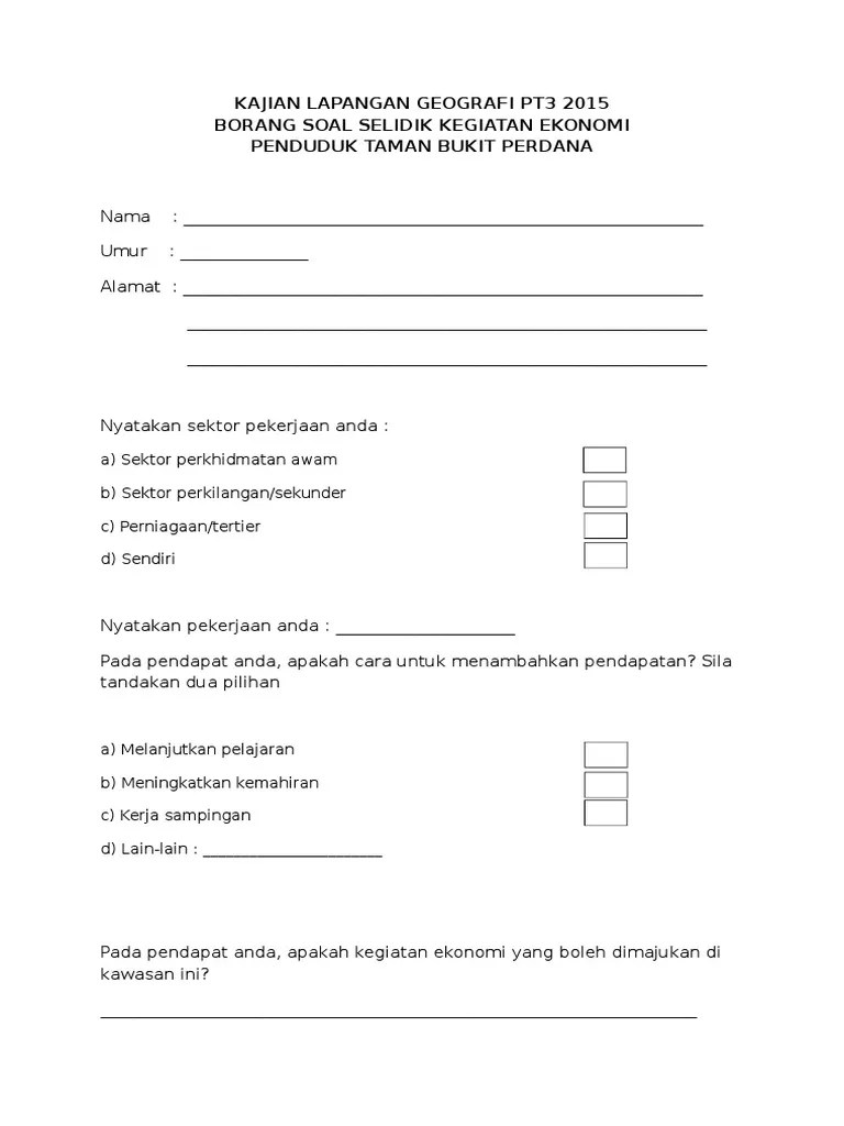Borang soal selidik tugasan geografi tingkatan 3 tajuk : View soal selidik.docx from geo 123 at smk darul ehsan. Tujuan soal selidik ini adalah untuk mendapat maklumat tentang kegiatan ekonomi di C0ntoh borang soal selidik geografi pt3,. Faktor yang mempengaruhi kegiatan ekonomi .